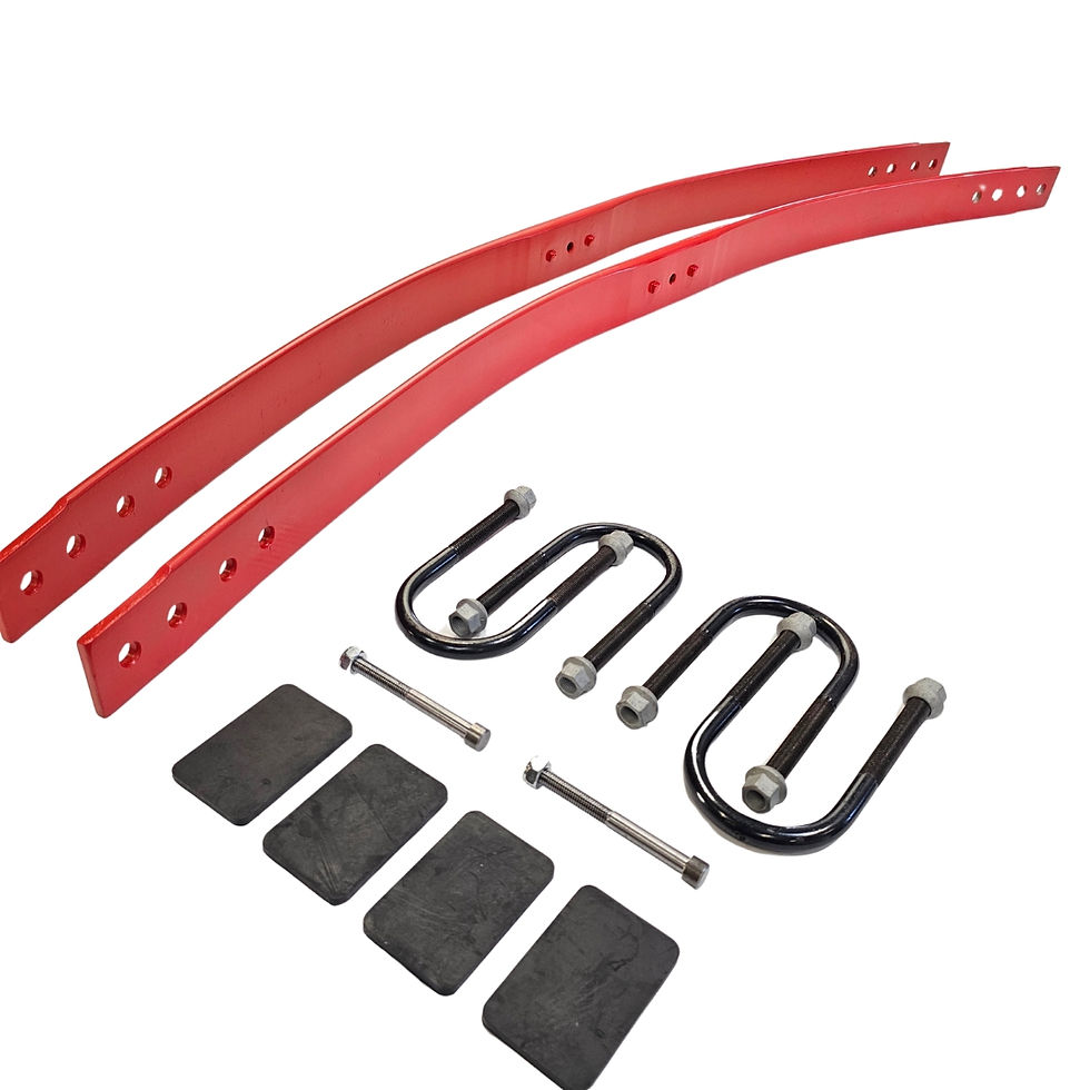 Pod oryginalne resory piórowe można zamontować dodatkowe resory, aby ograniczyć osiadanie pojazdu pod obciążeniem. Nasze zestawy zawierają przedłużone strzemiona (śruby U), śruby centrujące i niezbędne elementy montażowe.